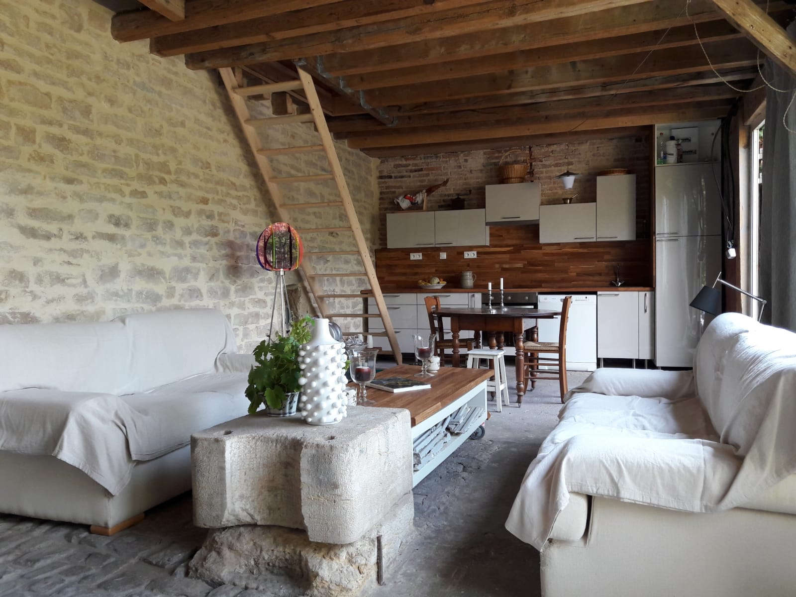 Le lieu a délibérément été pensé en contraste avec la maison principale et son caractère traditionnel. Ici, les deux pièces ouvertes font une large place au bois et à la pierre apparente et évoquent plus franchement la nature du lieu et ses origines. Le mobilier emprunte aussi au mélange d'époque et de styles qu'on trouve déjà dans le logis principal.